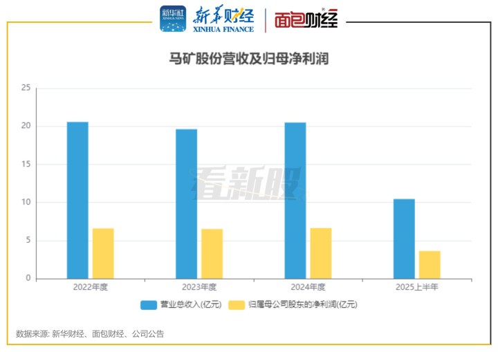 2022年至2024年及2025年上半年,马矿股份分别实现营业收入20.57亿元、19.62亿元、20.5亿元和10.45亿元,归母净利润分别为6.59亿元、6.54亿元、6.64亿元和3.62亿元,经营业绩相对稳定。