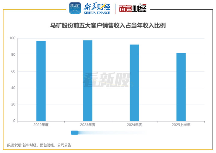 招股书显示,由于铁精粉存在一定的经济运输半径,导致马矿股份的客户大部分为福建省内的钢铁企业,客户相对集中。2022年至2025年上半年,公司对前五大客户的销售收入占当年收入的比例分别为96.89%、97.68%、92.50%和82.21%。
